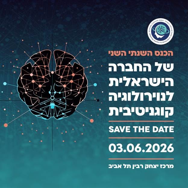חברות וחברים יקירים, הכנס השנתי השני של החברה הישראלית לנוירולוגיה קוגניטיבית יתקיים ב - 3 ביוני 2026, במרכז יצחק רבין תל אביב לפרטים >> לחצו כאן