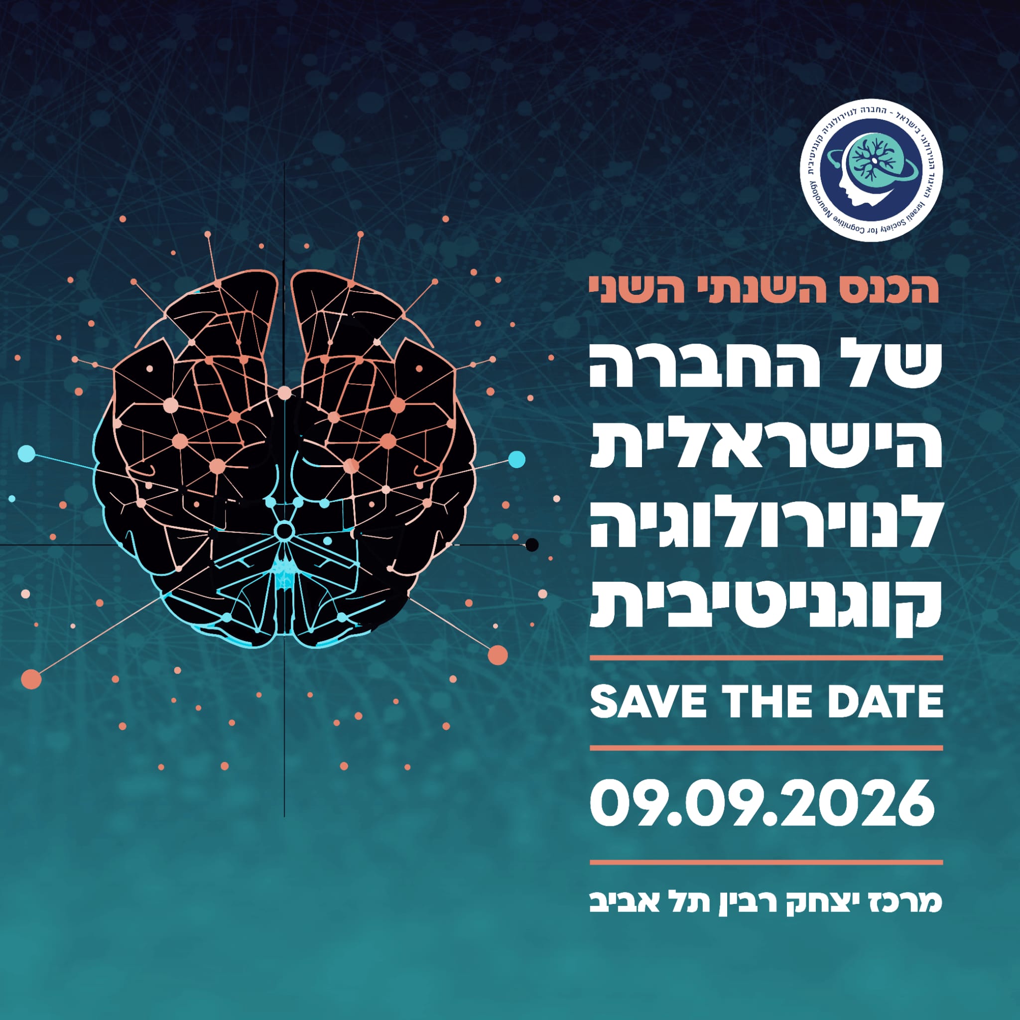 חברות וחברים יקירים, הכנס השנתי השני של החברה הישראלית לנוירולוגיה קוגניטיבית יתקיים ב - 9 בבספטמבר 2026, במרכז יצחק רבין תל אביב לפרטים >> לחצו כאן